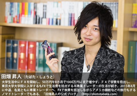 ■ウワサのギャル男トレーダー登場!2015年2月に刊行した著書『東大院生が考えたスマートフォンFX』(田畑昇人著・扶桑社・税込み1512円)がベストセラーとなっている田畑昇人さん。