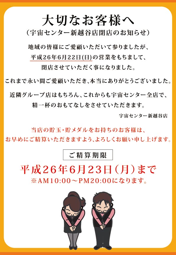 http://11382.p-world.jp大切なお客様へ(宇宙センター新越谷店閉店のお知らせ)