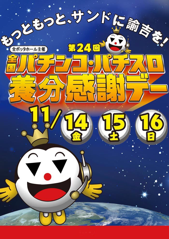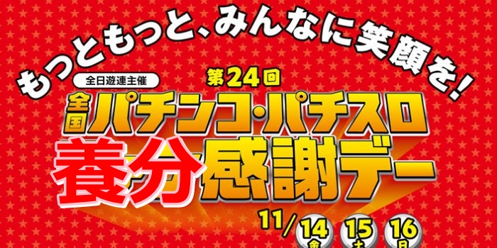 毎年恒例の、全日遊連主催の 「全国パチンコ・パチスロ ファン(養分)感謝デー」が、平成26年11月14日(金)、15日(土)、16日(日)の3日で現在開催されます。