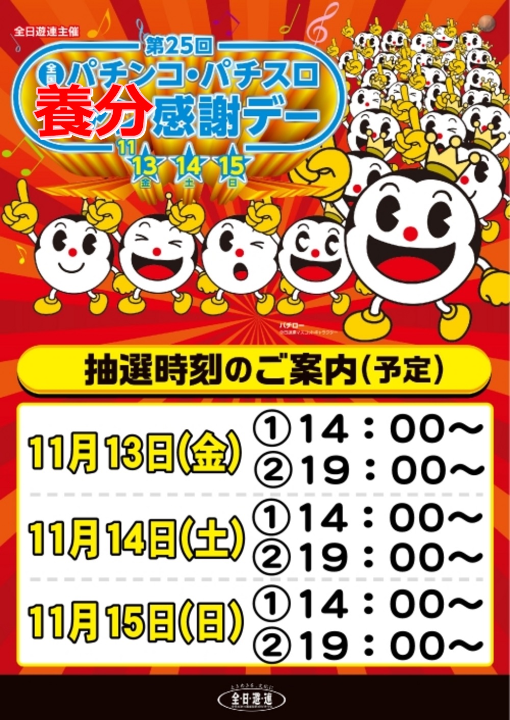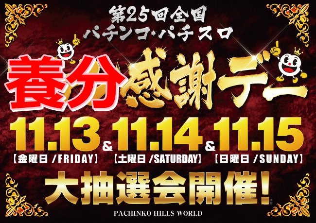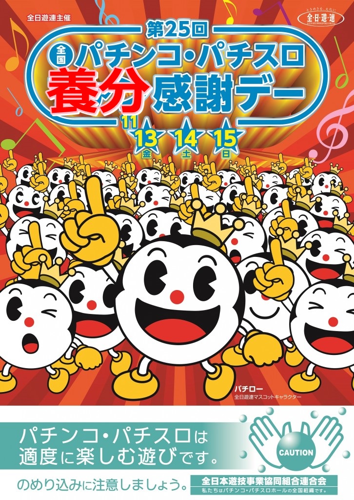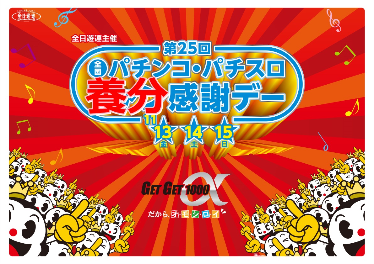 毎年恒例の、全日遊連主催の 「全国パチンコ・パチスロ ファン(養分)感謝デー」が、平成26年11月14日(金)、15日(土)、16日(日)の3日で現在開催されます。